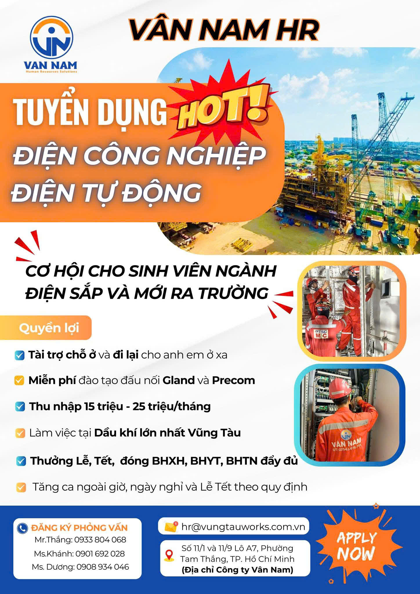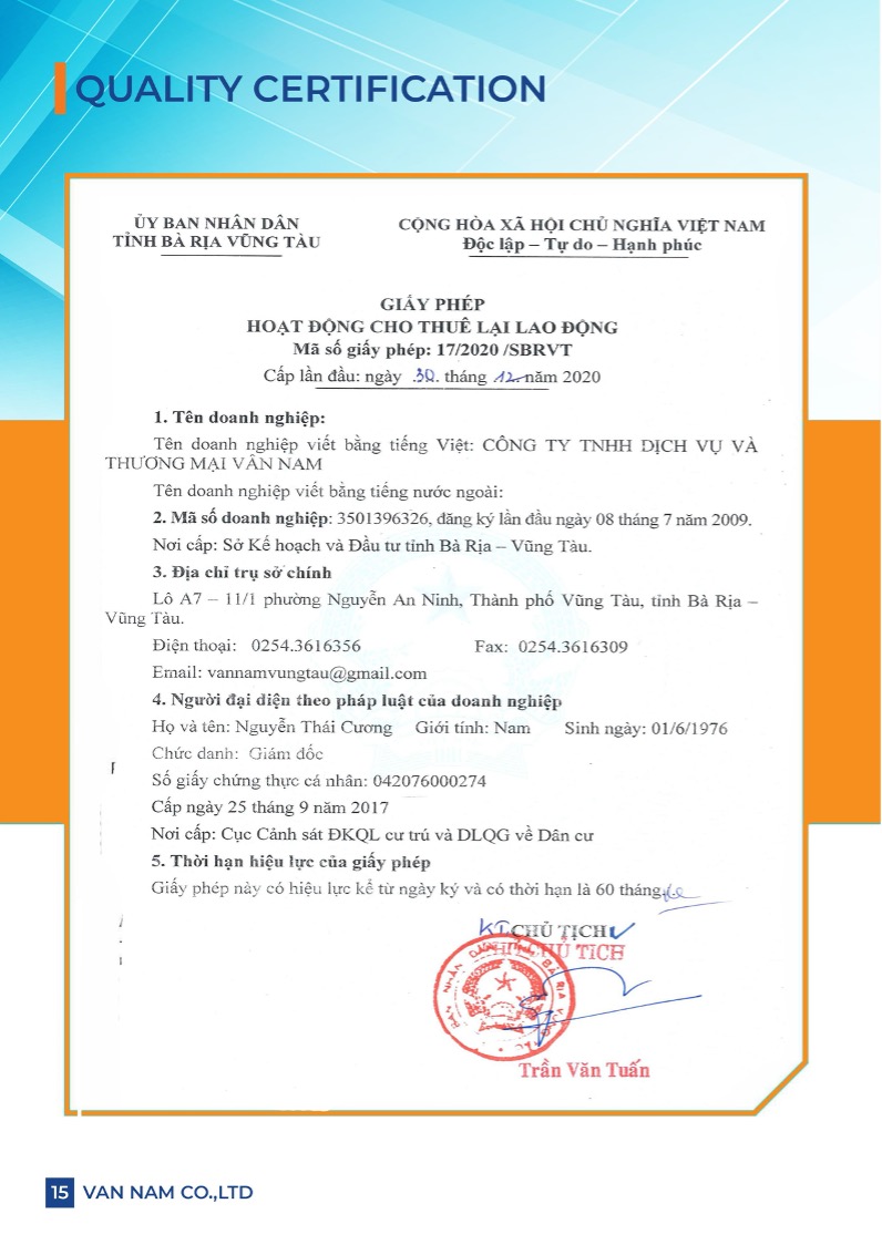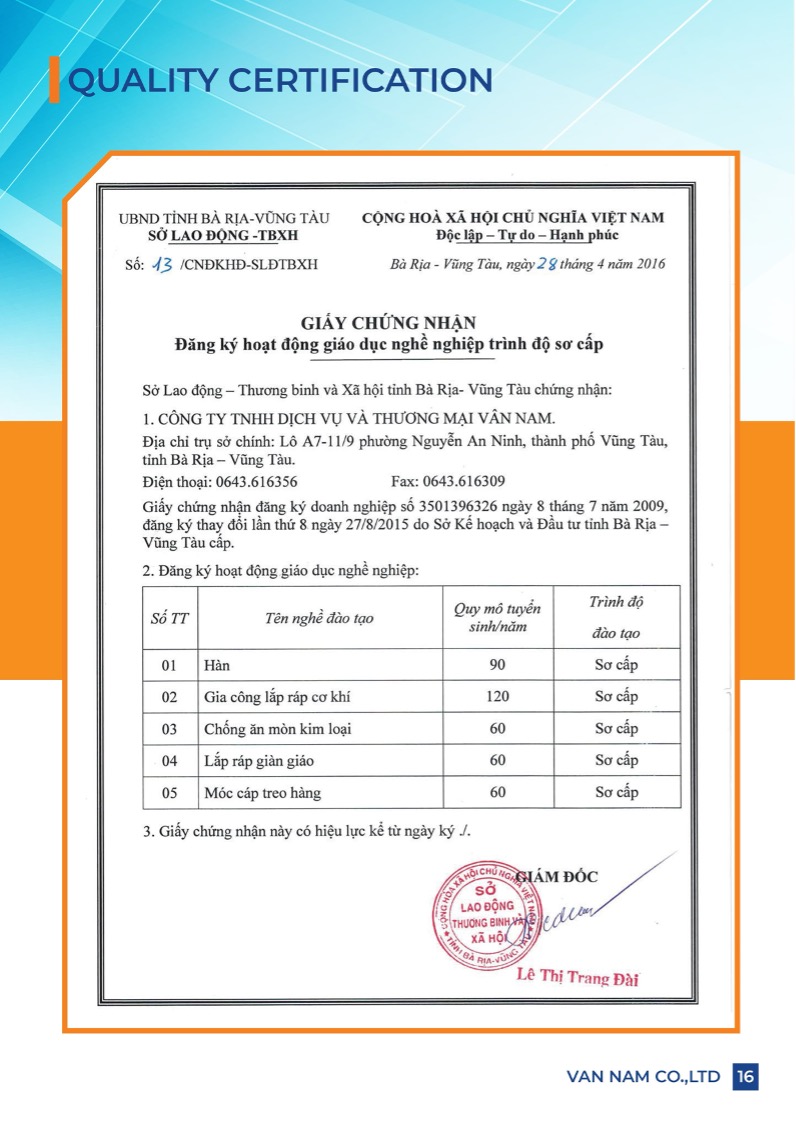 Công ty Vân Nam tự hào là đơn vị tiên phong trong lĩnh vực đào tạo nghề sơ cấp và cung ứng lao động cho các dự án trong và ngoài khơi thuộc ngành Dầu khí Việt Nam. Chúng tôi luôn lấy phương châm “Tận tâm – Sáng tạo – Chuyên nghiệp” làm kim chỉ nam, cam kết mang đến dịch vụ chất lượng cao, đội ngũ nhân sự được đào tạo bài bản, đáp ứng mọi yêu cầu khắt khe nhất của khách hàng và đối tác.
