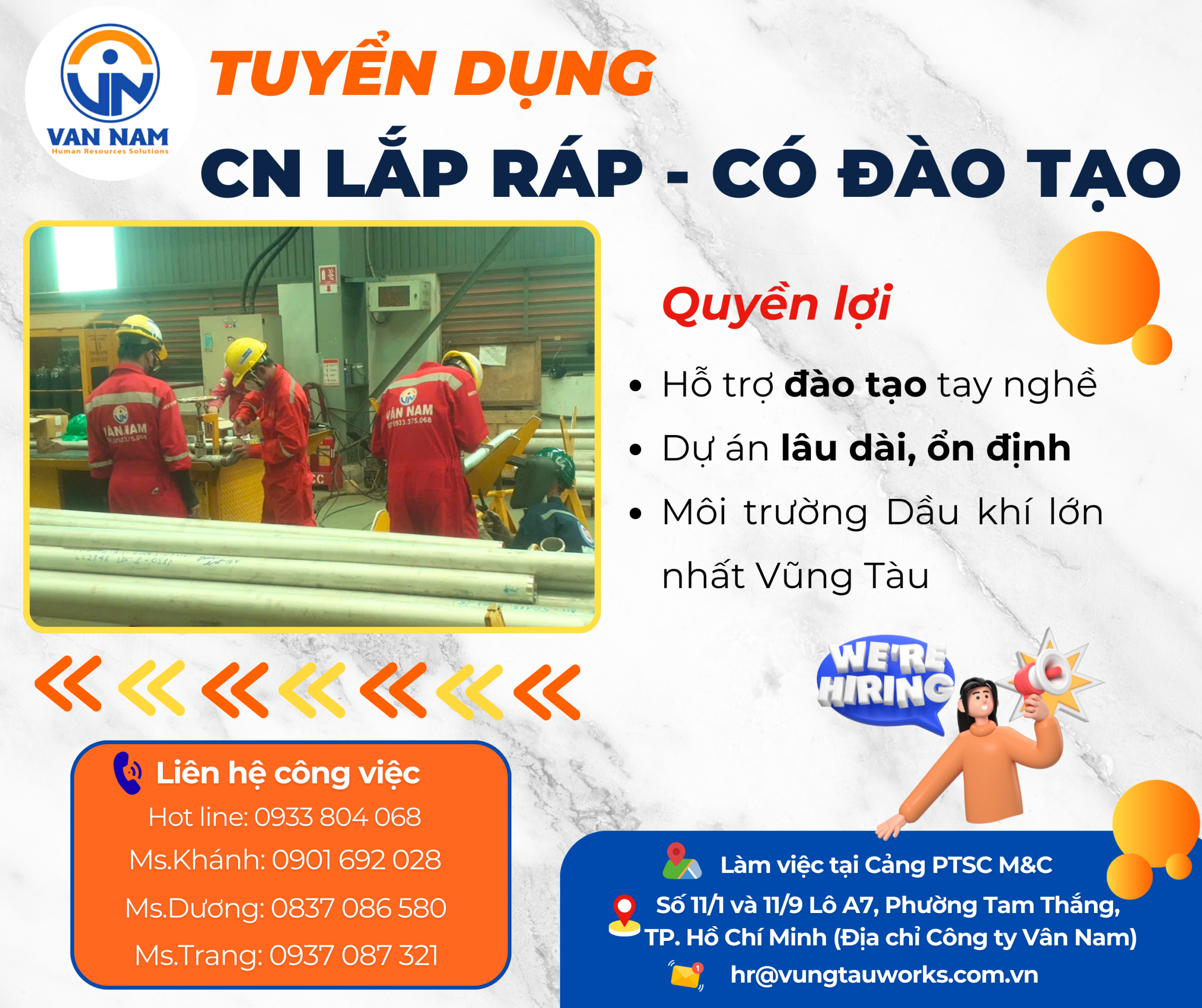 Tin tứcTUYỂN DỤNG THỢ LẮP RÁP – CÓ ĐÀO TẠO Đăng vào Tháng 12 19, 2025Tháng 12 19, 2025 bởi admin VÂN NAM TUYỂN THỢ LẮP RÁP – CÓ ĐÀO TẠO ANH EM NHANH TAY ĐĂNG KÝ NHÉ! Địa điểm làm việc: Cảng Cơ khí Vũng Tàu Địa chỉ Công ty Vân Nam : Số 11/1 – 11/9 Lô A7, Khu Đô Thị Chí Linh, P. Nguyễn An Ninh, TP. Vũng Tàu YÊU CẦU Sức khỏe tốt, tinh thần trách nhiệm cao Tuân thủ nội quy lao động, kỷ luật tốt Bằng cấp/Chứng chỉ ( nếu có ) QUYỀN LỢI & CHẾ ĐỘ Lương thưởng hấp dẫn, thưởng theo năng lực xứng đáng với tay nghề Chế độ bảo hiểm đầy đủ Thưởng lễ, Tết, phụ cấp chuyên cần, tăng ca Liên hệ ngay để ứng tuyển – Lương hấp dẫn – Đừng bỏ lỡ nha! Hot line: 0933 804 068 Ms.Khánh: 0901 692 028 Ms.Dương: 0837 086 580 Ms.Trang: 0937 087 321 #việclàmcơkhí #cơkhíVũngTàu #VanNamHr admin TUYỂN THỢ LÀM VIỆC TẠI KCN ĐÔNG XUYÊN